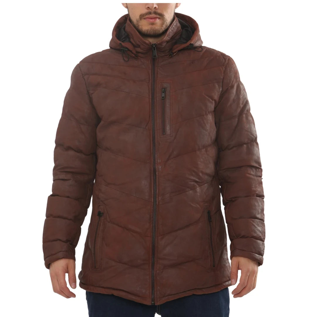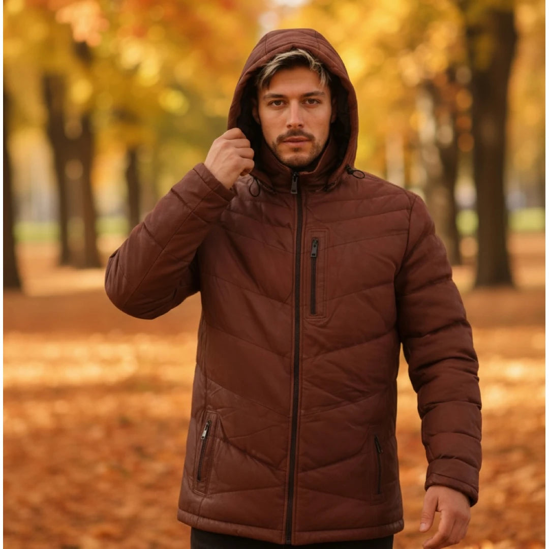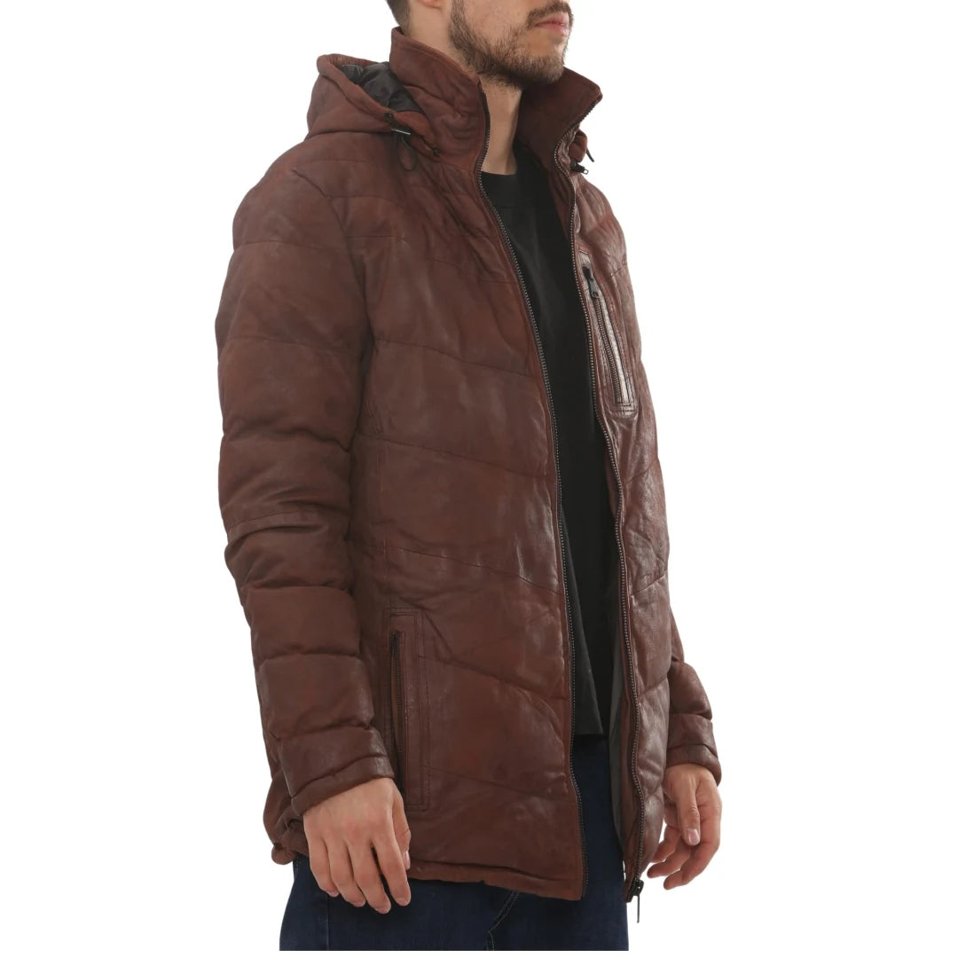 Men's Leather Puffer Jacket Hooded Quilted Winter Coat