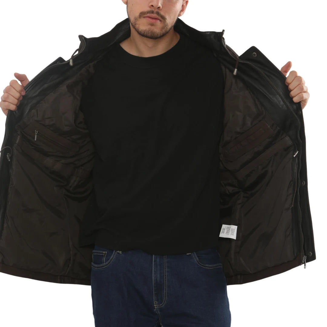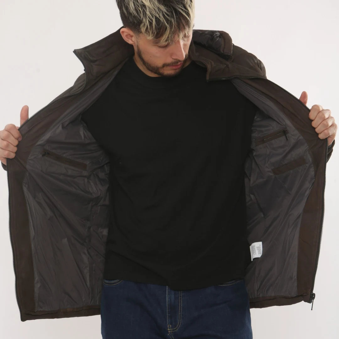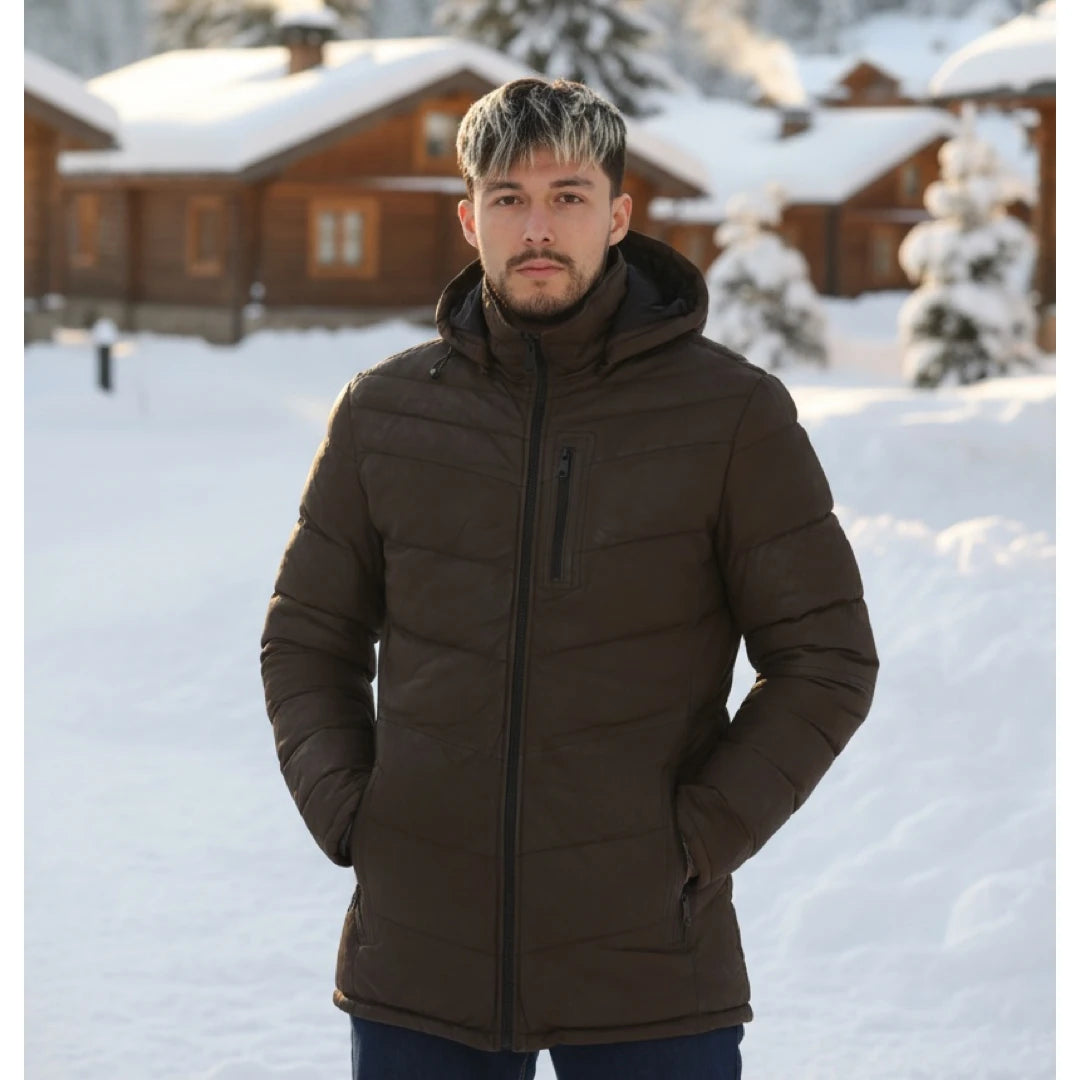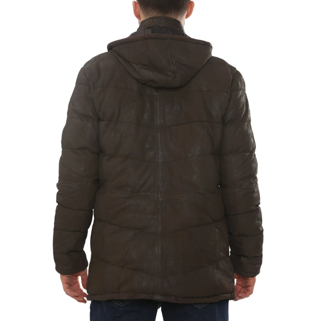 Men's Leather Puffer Jacket Hooded Quilted Winter Coat