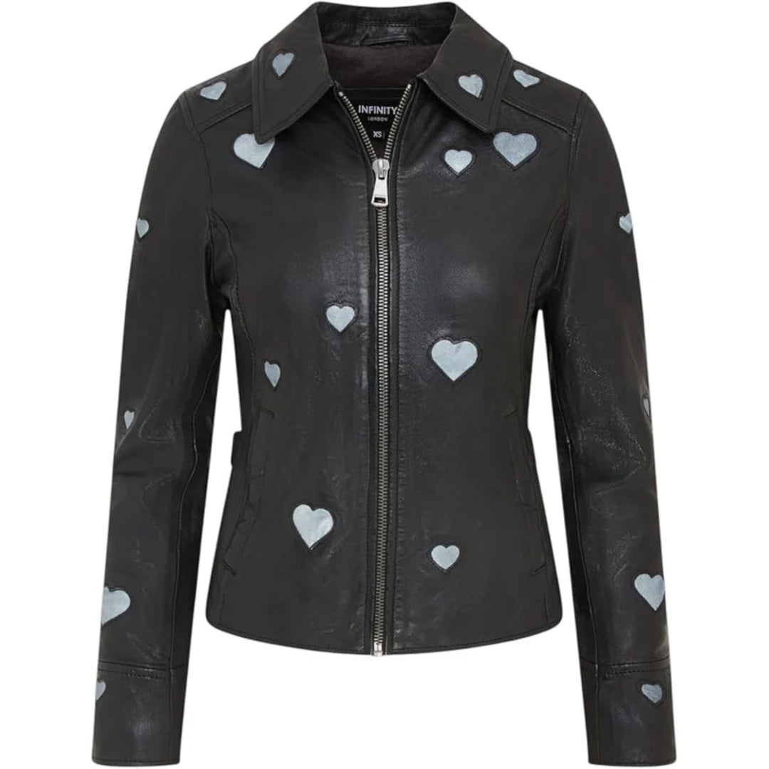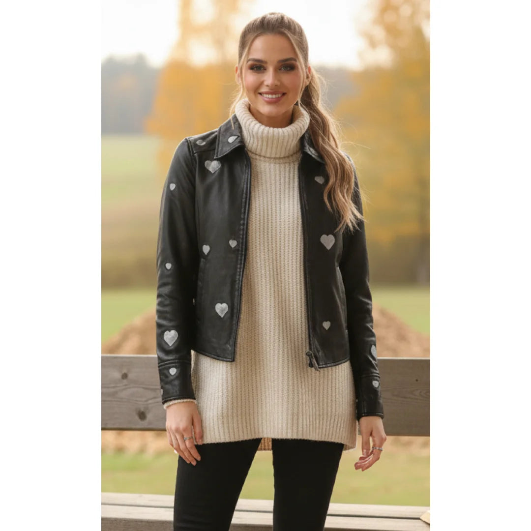 Women's Real Leather Shirt Collar Heart Print Jacket