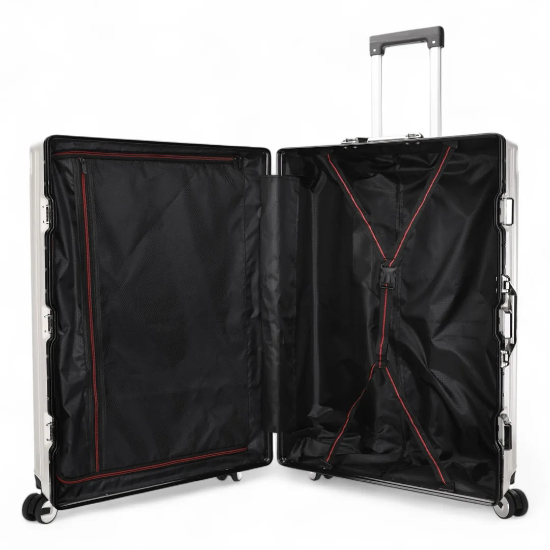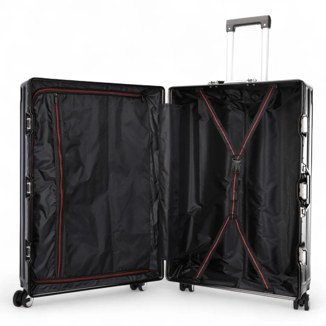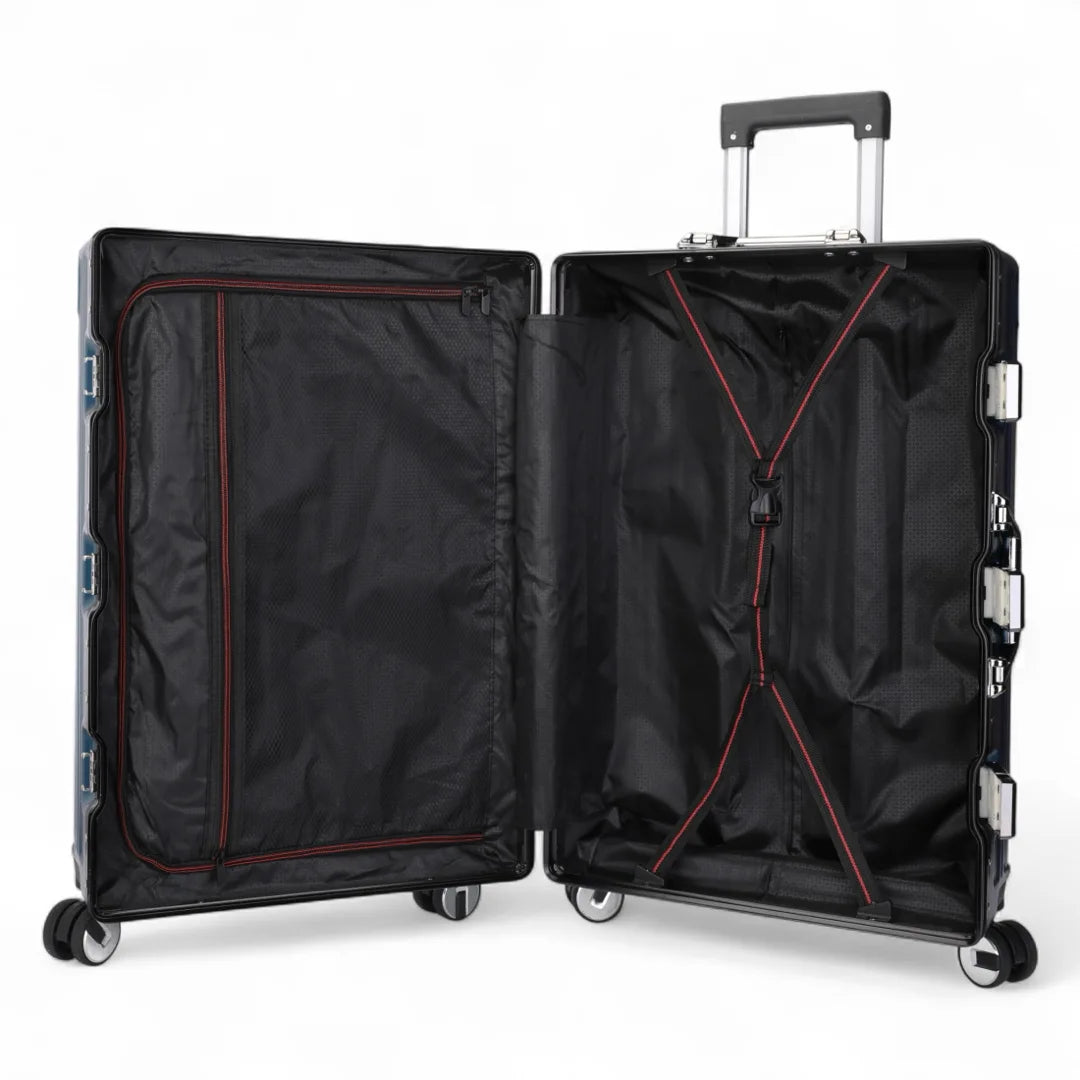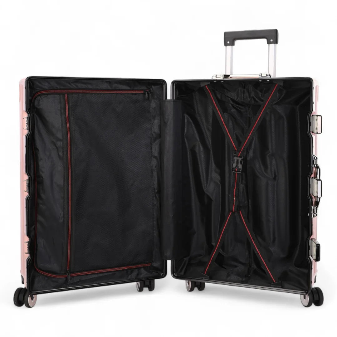 * Reinforced Aluminum Corner Frame: Designed with a sturdy aluminum frame at the corners, the luggage provides added structural support and enhanced durability against rough handling