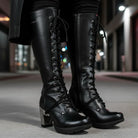 * Striking Gothic Design: A bold blend of gothic flair and urban style, these high boots stand out with their commanding silhouette, metallic heel accents, and intricate lace-up detailing