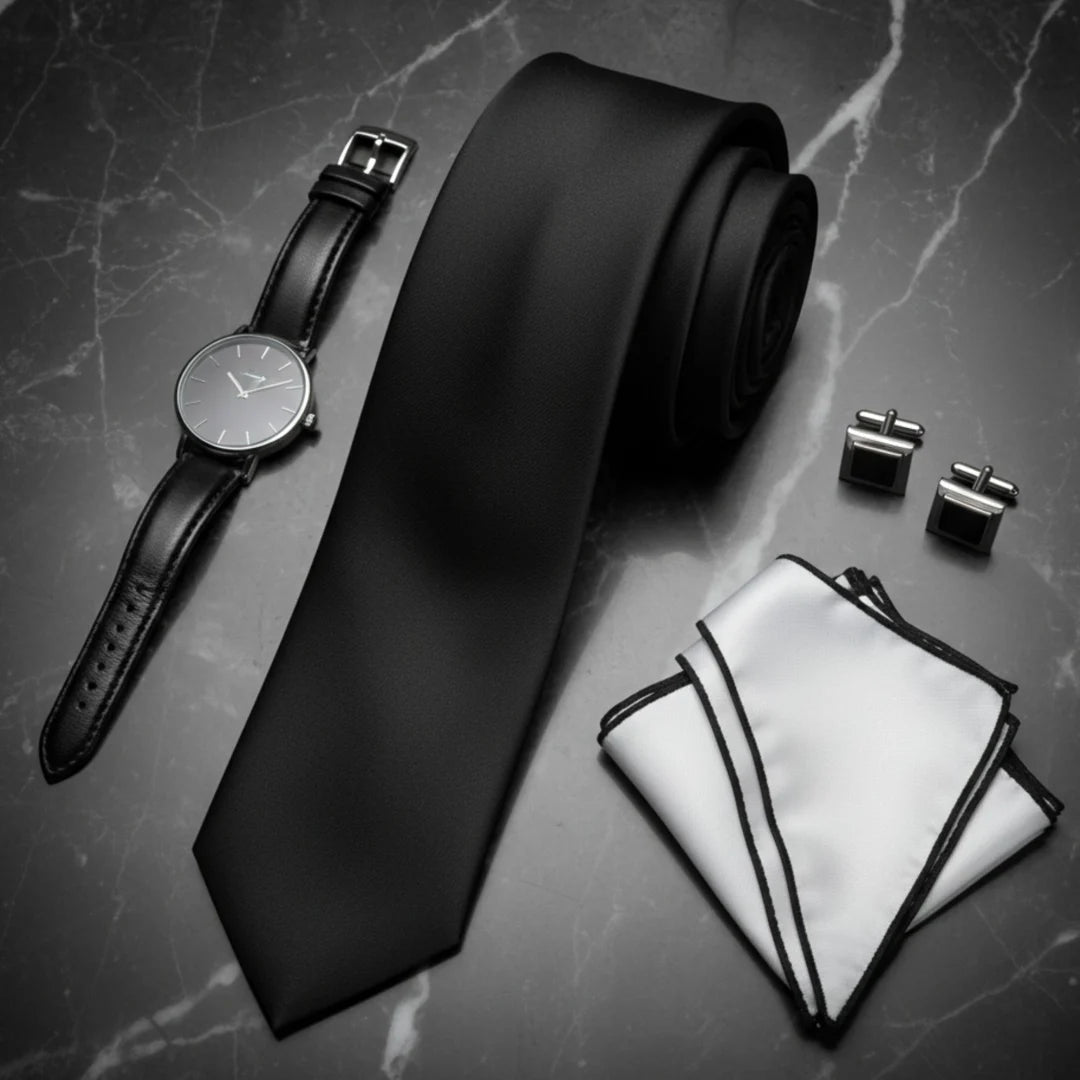 - The men’s tweed tie should be darker than the shirt and in one color.
