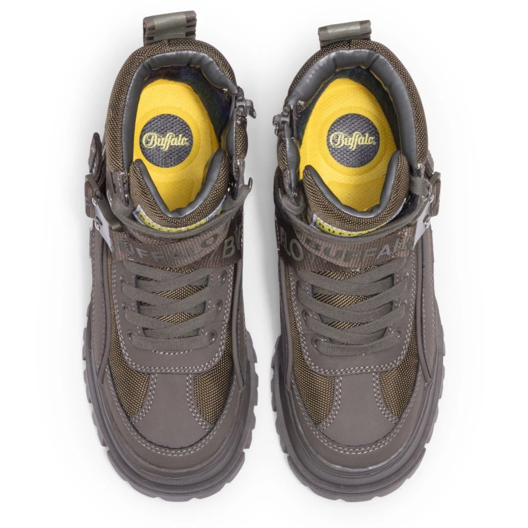 Las botas para mujer Buffalo ASPHA COM1 de media caña en verde caqui cuentan con una parte superior duradera de Nappa vegana y textil, combinando materiales éticos con calidad duradera. Su diseño con cordones asegura un ajuste seguro y ajustable, mientras que la suela gruesa con dibujo ofrece una tracción fiable y un aspecto distintivo de plataforma inspirado en el estilo militar. Estas botas ofrecen tanto estilo como funcionalidad, perfectas para añadir un toque moderno y atrevido a tu guardarropa sin comprometer la comodidad ni la sostenibilidad.