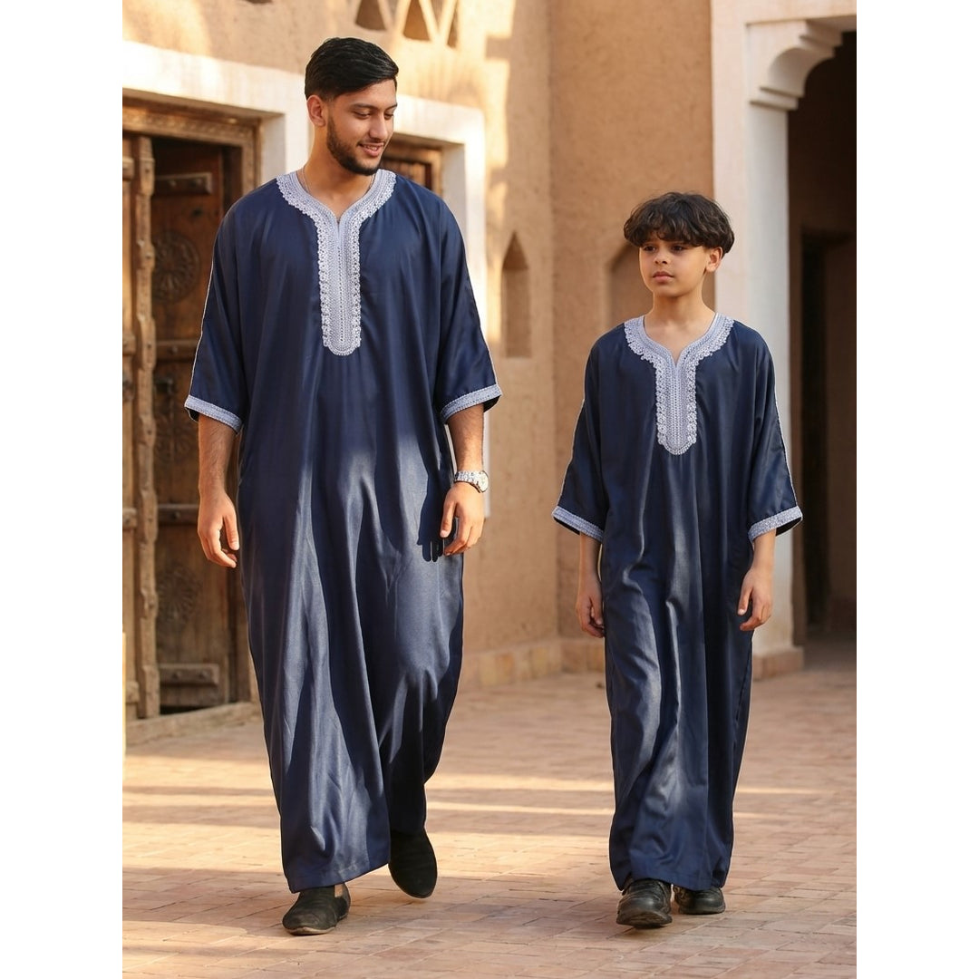 * Design marocain authentique : Présente une broderie bleue traditionnelle, mettant en valeur le riche patrimoine culturel et le savoir-faire des vêtements marocains.
